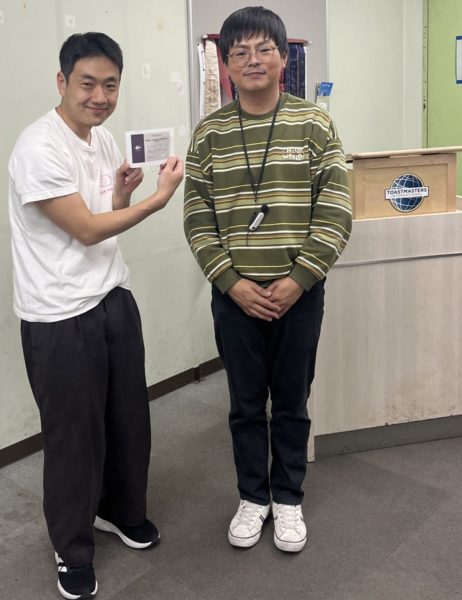 営業職をされているS村さん。あるとき会社でふっと、自分は裏方を下に見ていた瞬間があったんじゃないか?と感じた。トーストマスターズ業界では、運営の大ベテランとしてとても頼りにされているS村さんだけど、便利遣いされているんじゃないかと感じたことも、時折ある。裏方の支えは あるのが当たり前、ではなくて、ありがたいこと。自分も会社で その意識を新たにした、というスピーチでした。